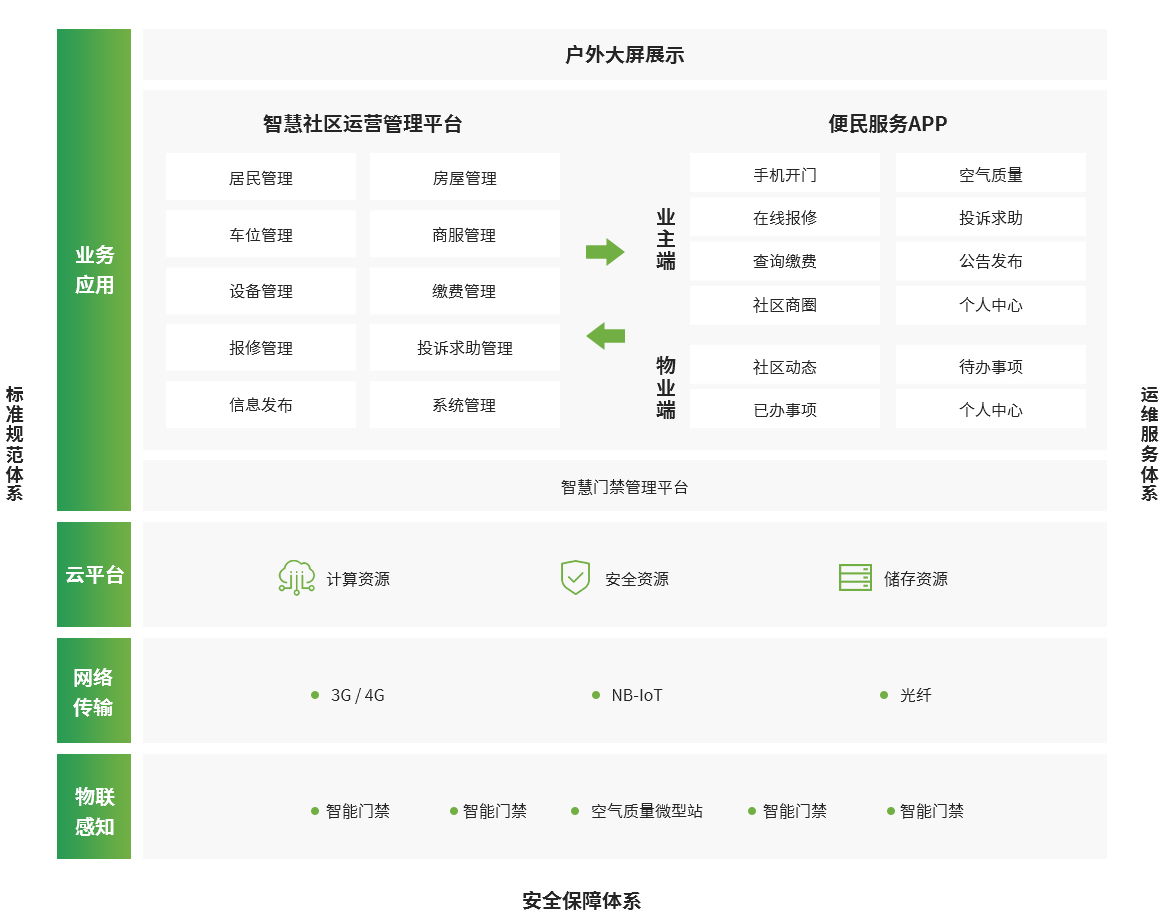 本項目采用先進、開放、標(biāo)準(zhǔn)、主流、成熟的基礎(chǔ)平臺、開發(fā)手段與信息技術(shù)規(guī)范,滿足智慧社區(qū)對平臺建設(shè)先進性、開放性、標(biāo)準(zhǔn)化、穩(wěn)定性、可擴展性的需要。按照公共安全、物業(yè)管理和便民服務(wù)的基本功能需求,共包括物聯(lián)感知層、網(wǎng)絡(luò)傳輸層、云平臺層、業(yè)務(wù)應(yīng)用層四個層次。